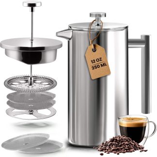 KICHLY 350ml Stainless Steel French Press – Double Wall Coffee Press – Stainless Steel Plunger Coffee & Tea Maker (Silver, 0.35 Ltr, Pack of 1)